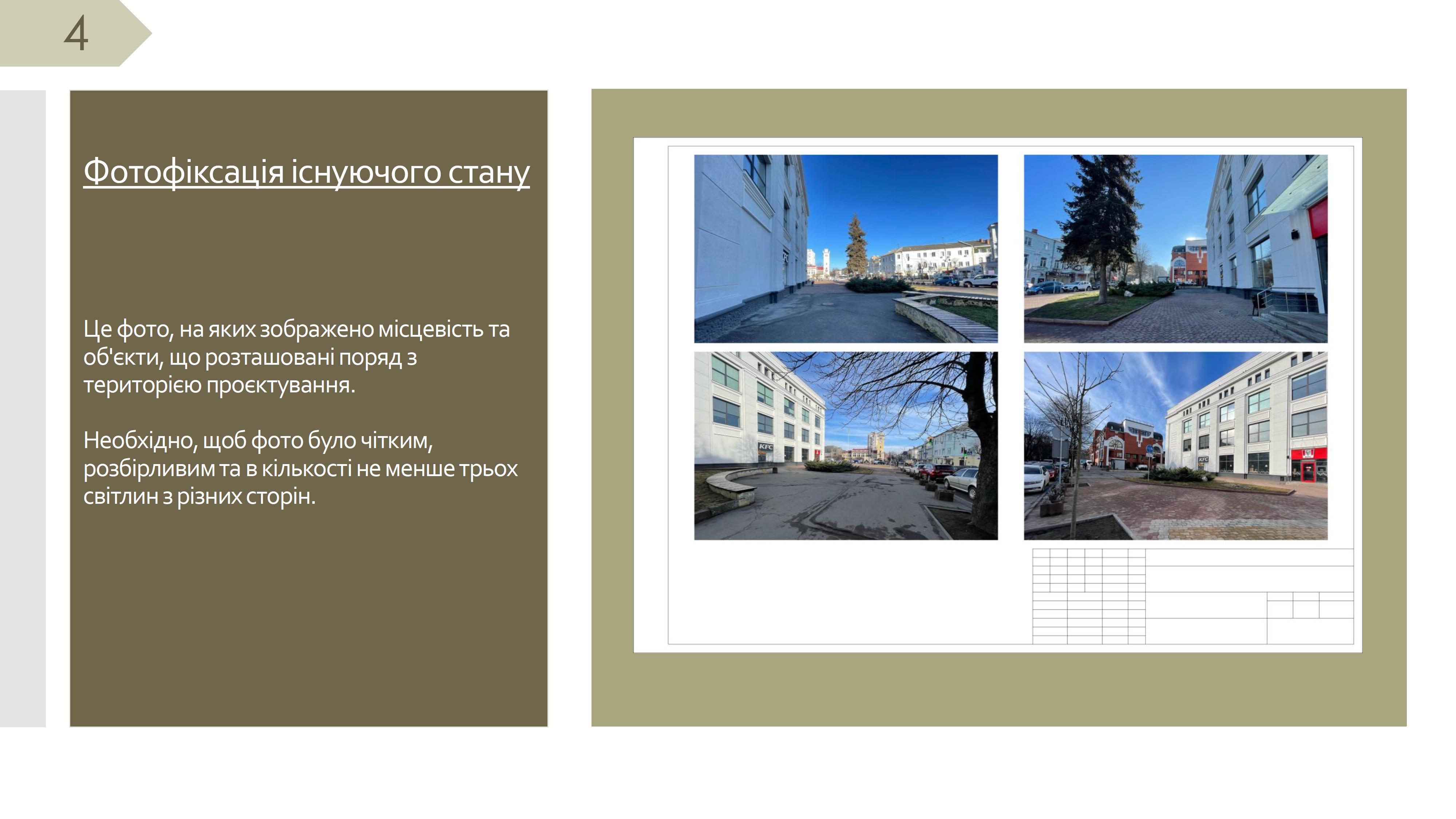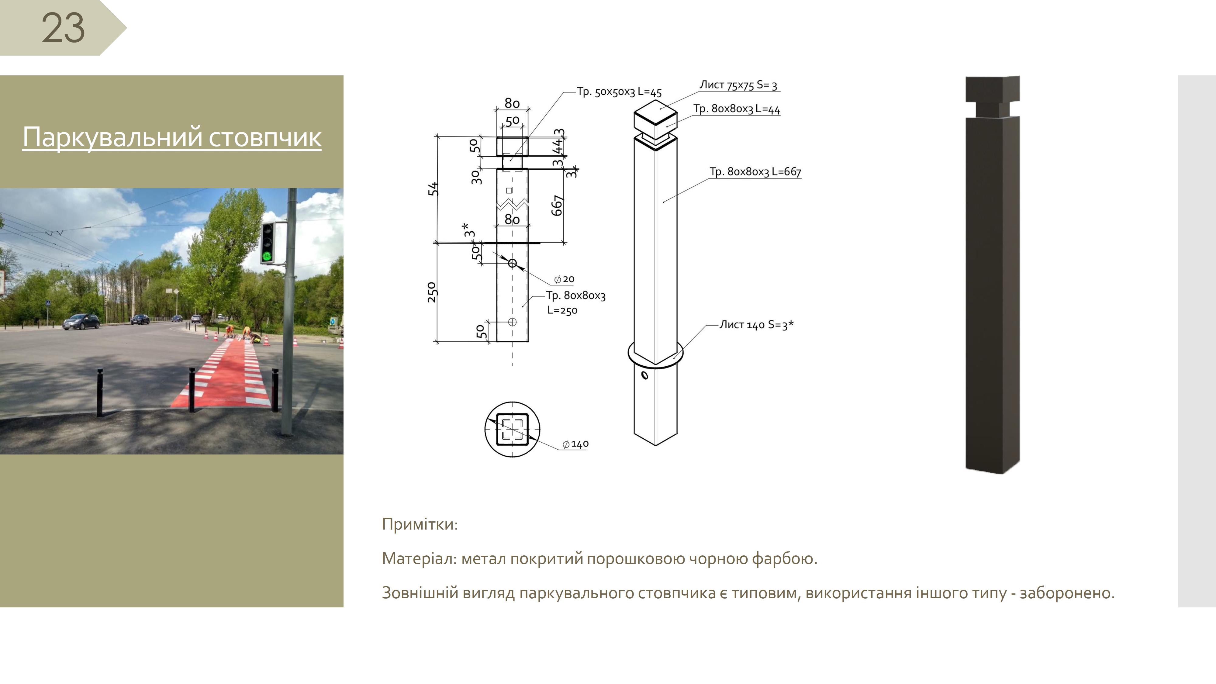 3.4. Усі елементи благоустрою (тверде покриття, лави, урни, паркувальні стовпчики, велосипедні стійки тощо) наносять на схему благоустрою прилеглої території міського простору, та в умовних позначеннях зазначається їх кількість та розміри. На додаткових листах зображуються елементи благоустрою у розрізі із зазначенням матеріалів та габаритних розмірів елементів благоустрою.