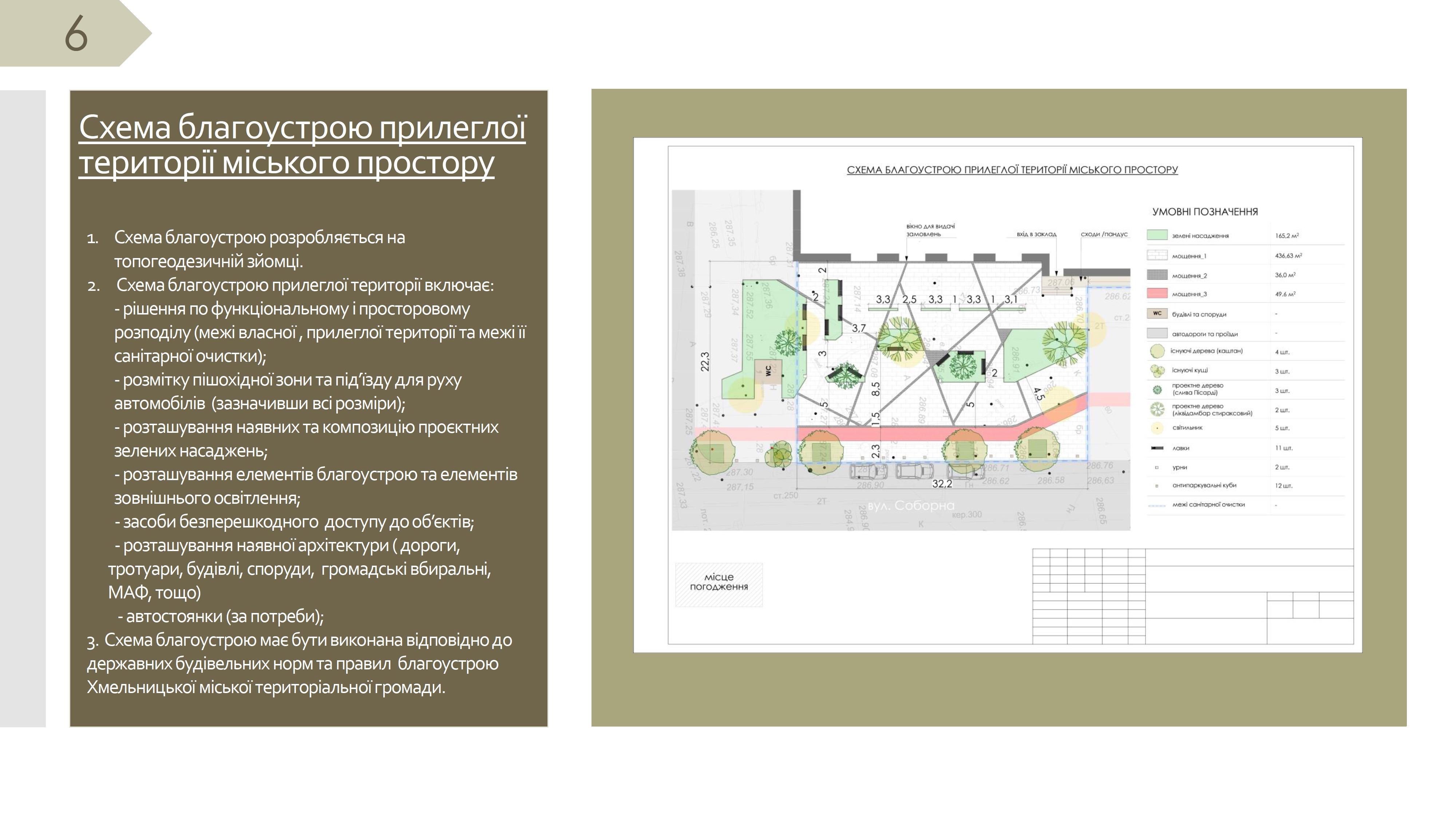 3.3. На схемі благоустрою прилеглої території міських просторів, яка є головною сторінкою в ескізному проєкті благоустрою прилеглої території міських просторів на території Хмельницької міської територіальної громади зазначається дизайнерська графічна розробка зовнішнього вигляду ландшафту.