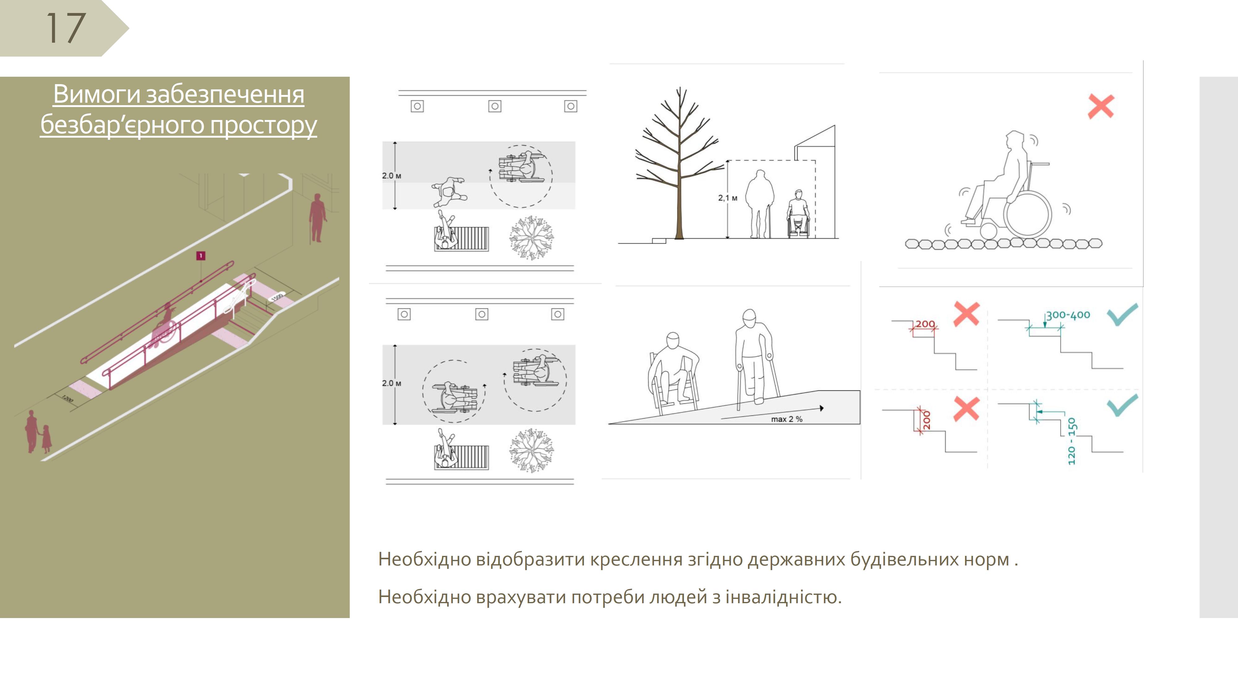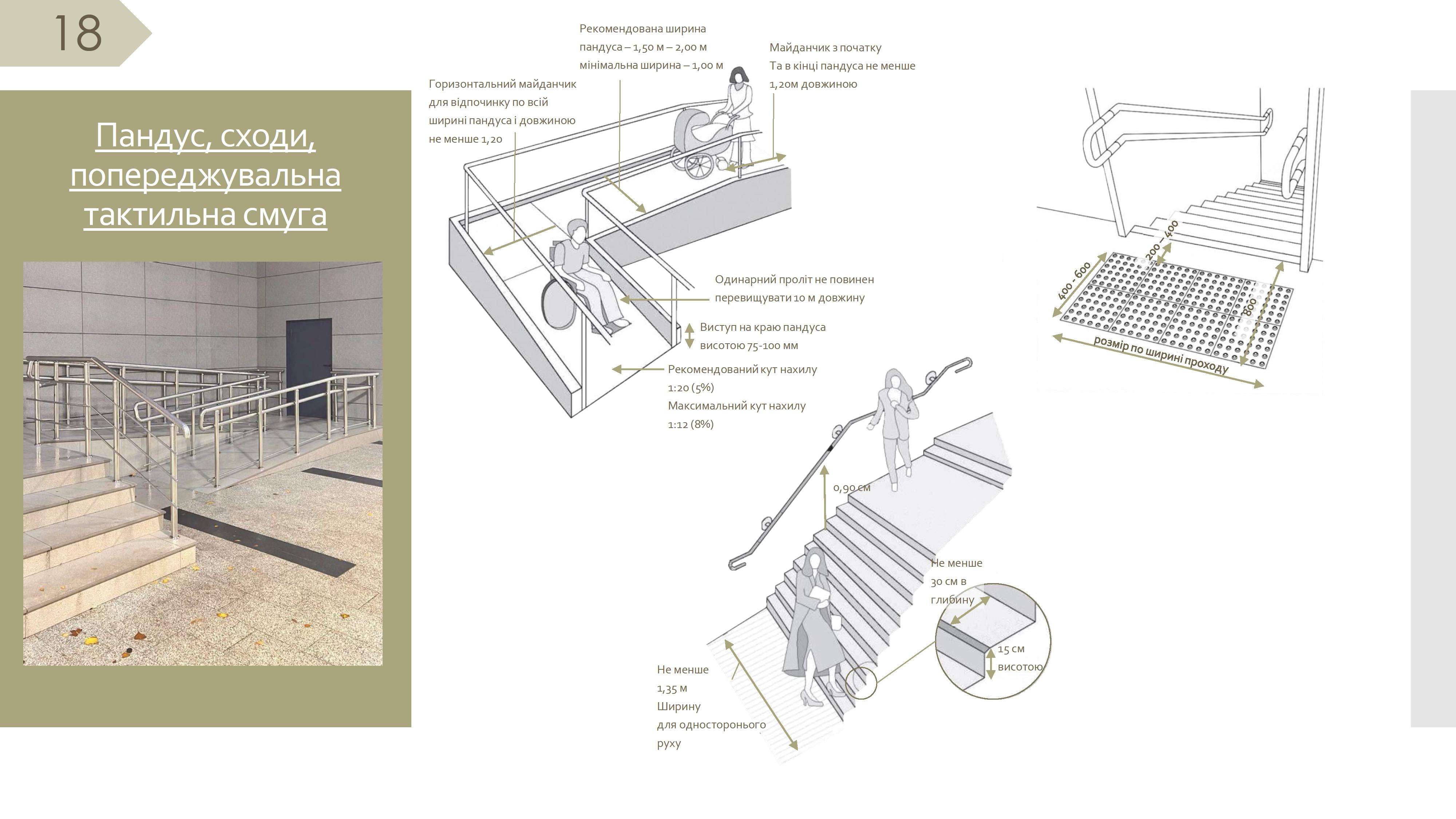 3.8. Улаштування сходів, пандусів та ліфтів виконується з легких конструкцій згідно з вимогами ДСТУ EN 81-70, піднімальні платформи, вертикальні підйомники згідно з вимогами ДСТУ ISO 9386-2 або інші пристрої для переміщення. (6.1.8. ДБН «Інклюзивність будівель і споруд. Основні положення»).
