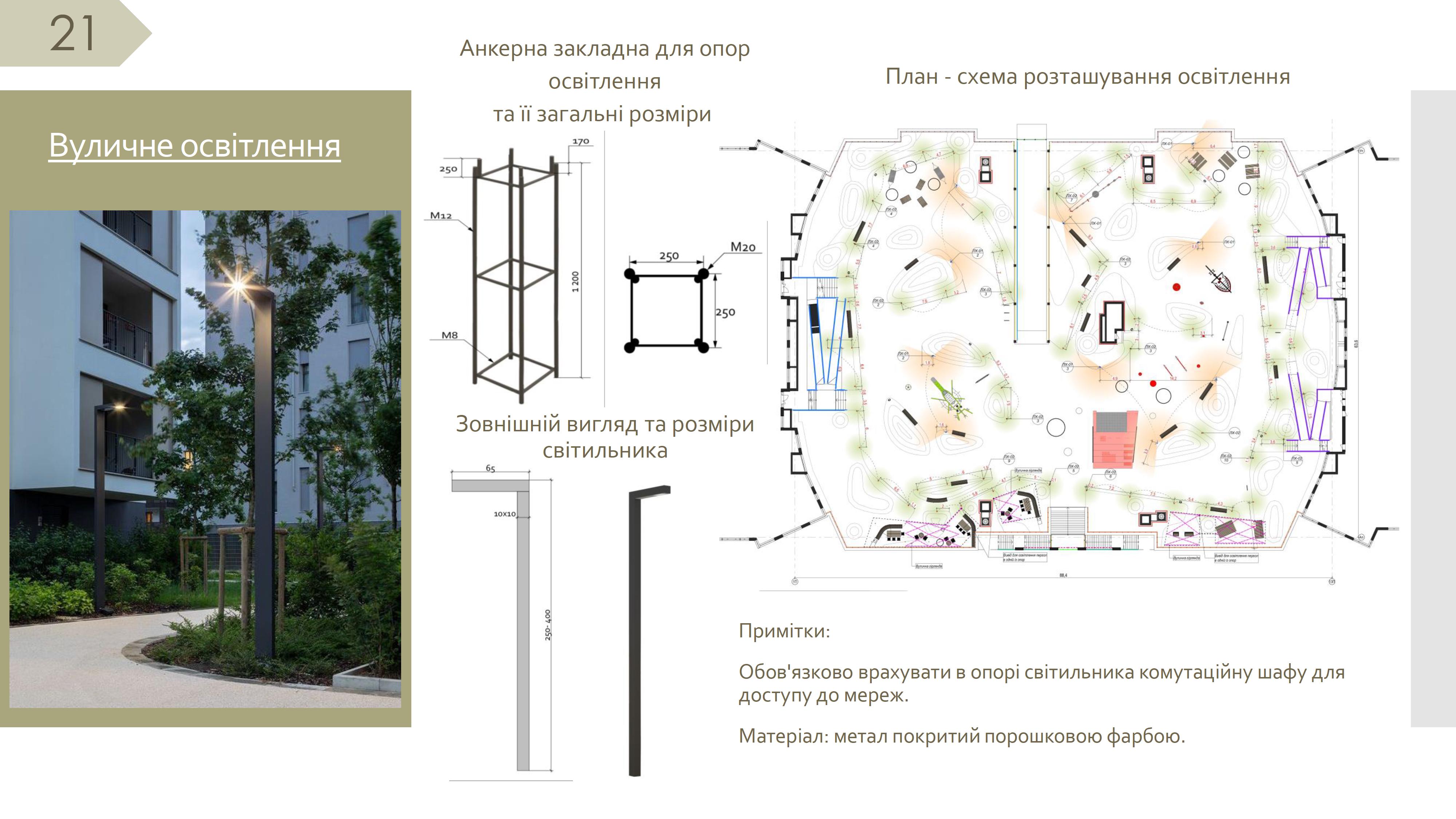 3.11. За необхідності улаштування зовнішнього освітлення виконується на всій площі прилеглої території міських просторів. В такому випадку до ескізного проєкту благоустрою прилеглої території міських просторів на території Хмельницької міської територіальної громади розробляється план-схема розташування освітлення, яка включає в себе зовнішній вигляд світильників, місця розміщення та схема підключення мереж (за потреби).