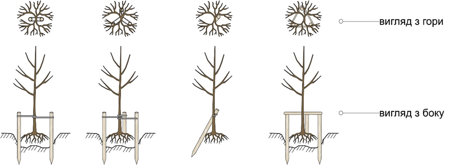 - тип кріплення, а також розмір і міцність опор (кілків) визначається залежно від розміру дерева і використання на ділянці;