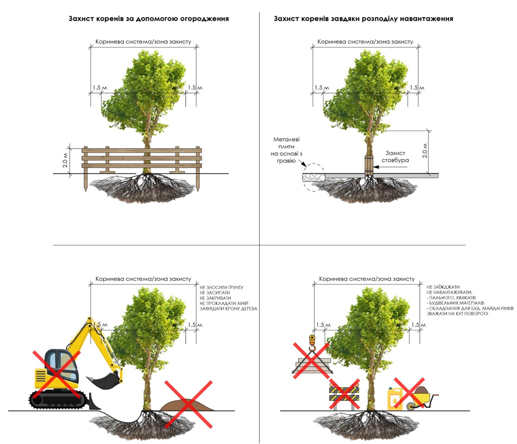 - необхідно дотримуватися відстані між проєктованим деревом та наявною інфраструктурою, відповідно до Правил утримання зелених насаджень у населених пунктах, затверджених Наказом Міністерства будівництва, архітектури та житлово-комунального господарства України від 10.04.2006р. №105 (додатки 5, 6, 7, 8 до Порядку);