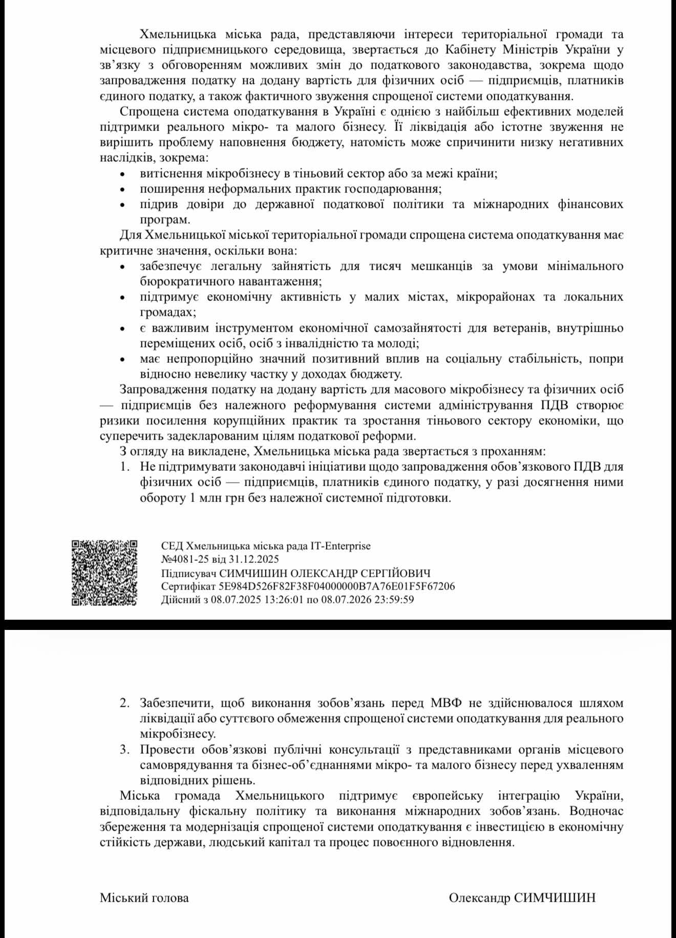 Хмельницький міський голова Олександр Симчишин звернувся до Верховної Ради України та Кабінету Міністрів України щодо збереження спрощеної системи оподаткування для ФОП і мікробізнесу.