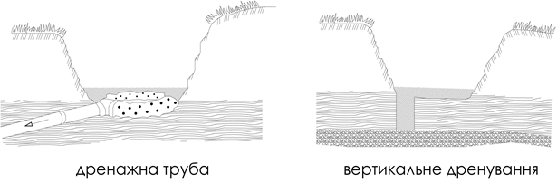 - при потребі, внизу лунки улаштовують дренаж з щебню крупної фракції, встановлюють дренажну трубу або вертикальне дренування (мал. 1).