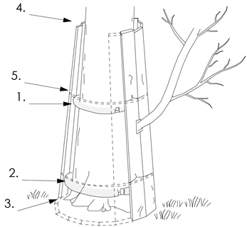 - система кріплення повинна бути достатньою, щоб підтримувати дерево, дозволяючи певний рух стовбура для розвитку бічних опорних коренів;