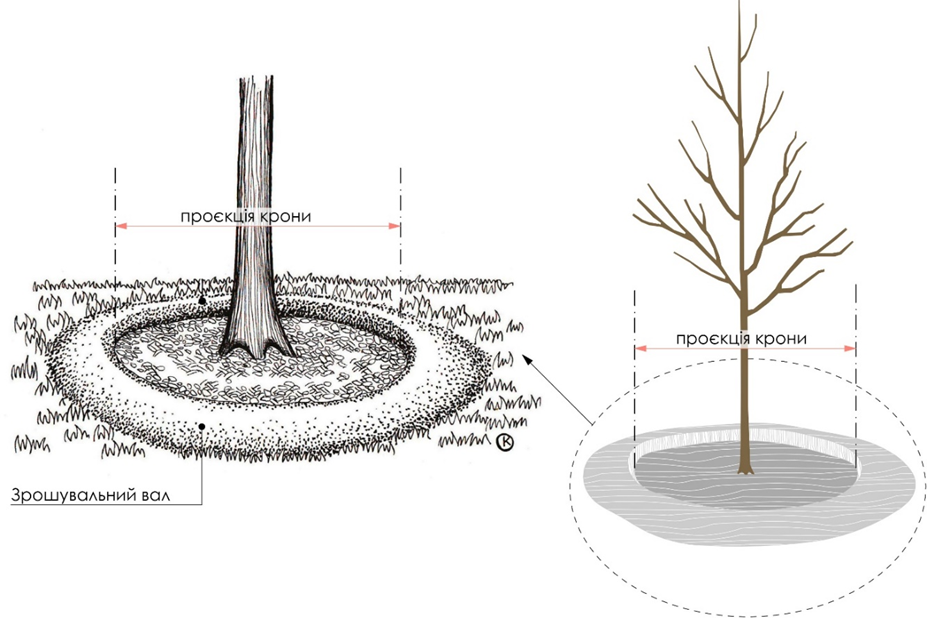 - після посадки у лунці формується зрошувальний вал навколо дерева по проєкції крони або більше та проводиться мульчування пристовбурних кіл щепою або сосновою корою для підвищення ефективності поливу, убезпечення верхнього шару ґрунту від пересихання та надмірного ущільнення. Мульчу в ґрунт вносити не засипаючи при цьому прикореневу шийку дерева (мал. 4).